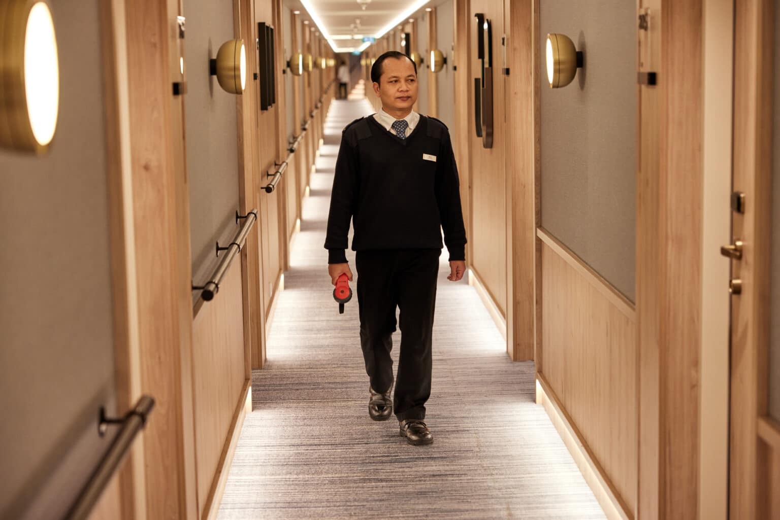 As a night watch, you manage the reception at night, answering telephone calls and guest requests. You do hourly security patrols through the ship with several checkpoints. You are also responsible for early-riser breakfasts and assist with housekeeping duties when needed.